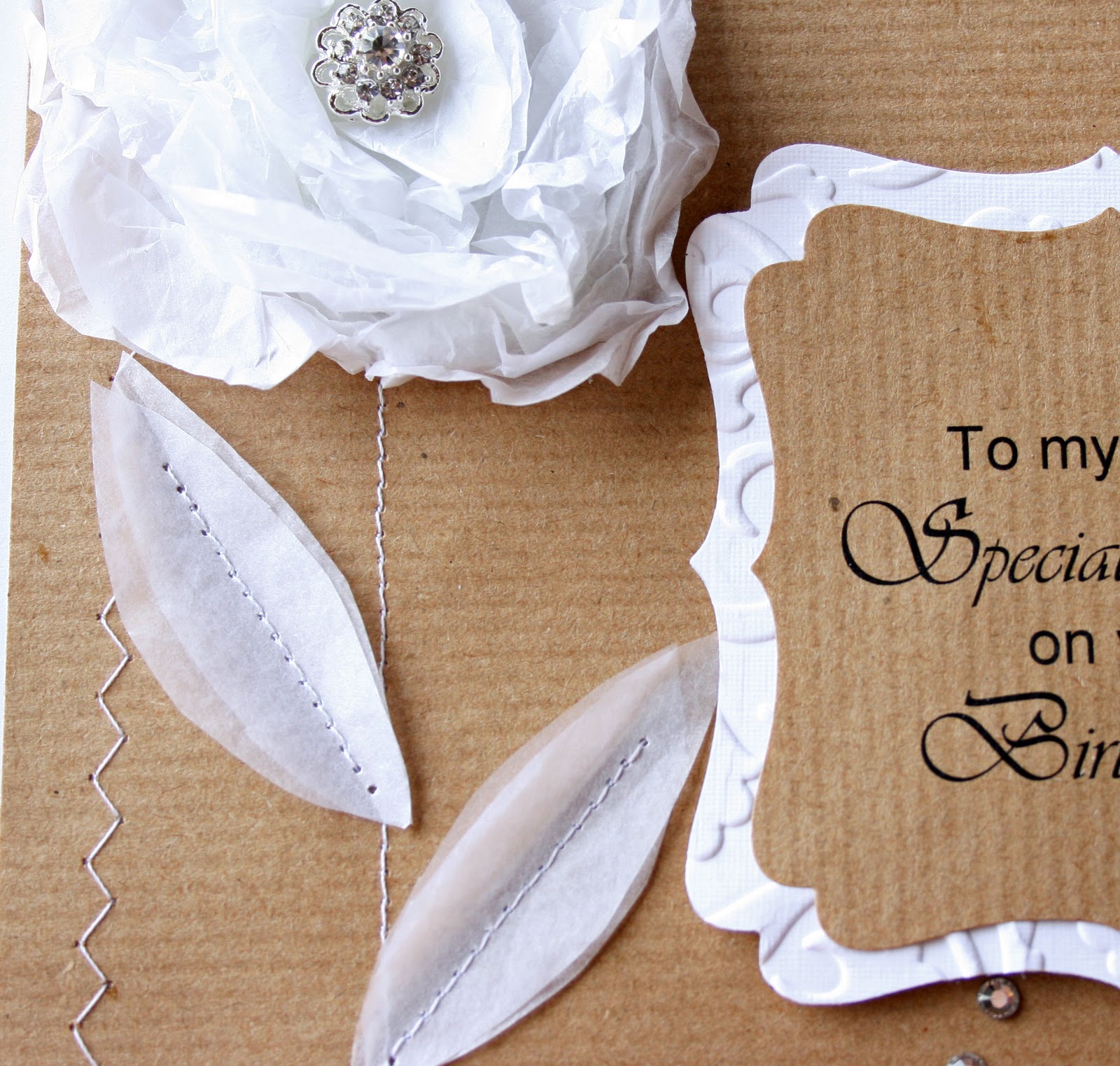 I stretched the zigzag stitch around the outside edge of the kraft paper and added some flowers to the bottom corner to hide the (not so neat join!). And of course one of my cards wouldn't be fully complete without a bit of sparkle courtesy of these lovely swarovski crystals - although in the photo below they look positively dull (should have used my flash maybe)!!!!!